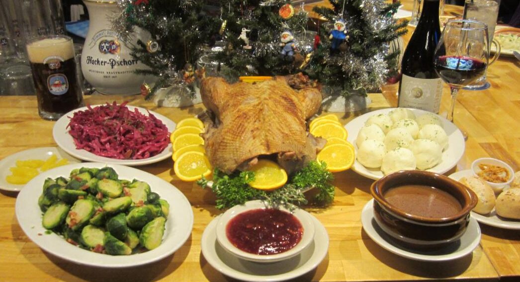 Die Weihnachtsgans = the Christmas Goose. A traditional German Roast Goose is always served with Braised Red Cabbage, Blaukraut oder Rotkohl, Potato Dumplings, Kartoffelknödel, a homemade gravy, Preiselbeeren on the side as well as sliced Orange for a pop of freshnes. Our Geese range from 8 to 10 pounds raw weight, we charge per pound and include all the fixings listed above for six guests. Please order your Goose at least 24 hours in advance for us to create the perfect Christmas Memories.